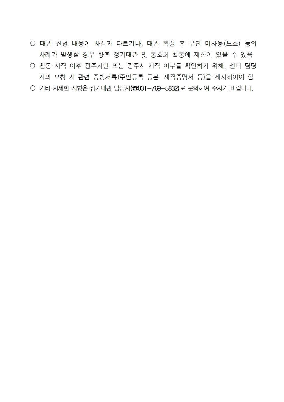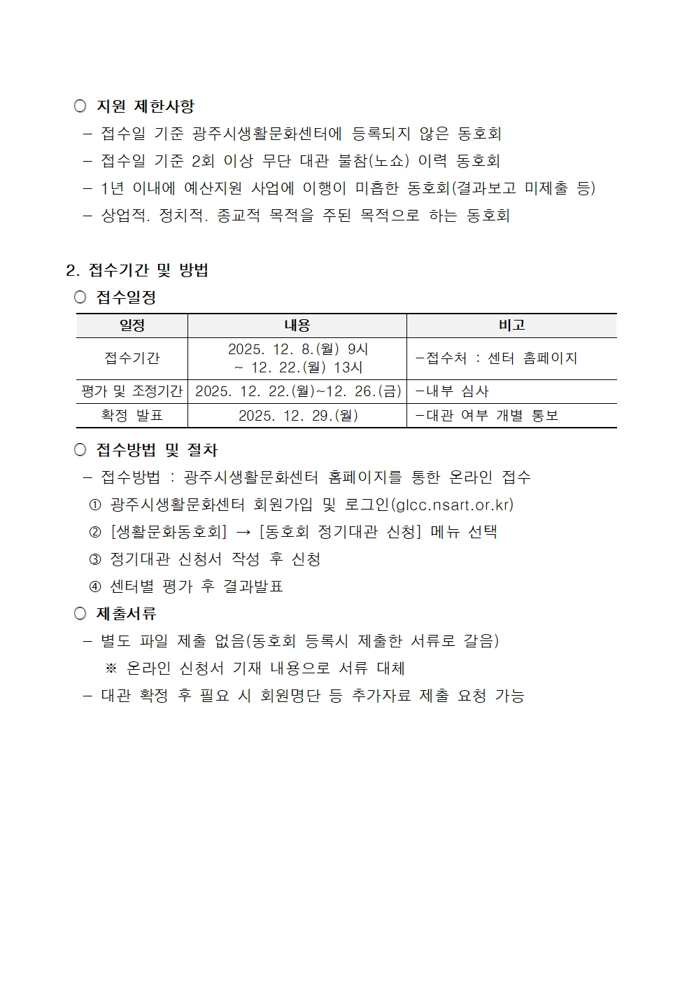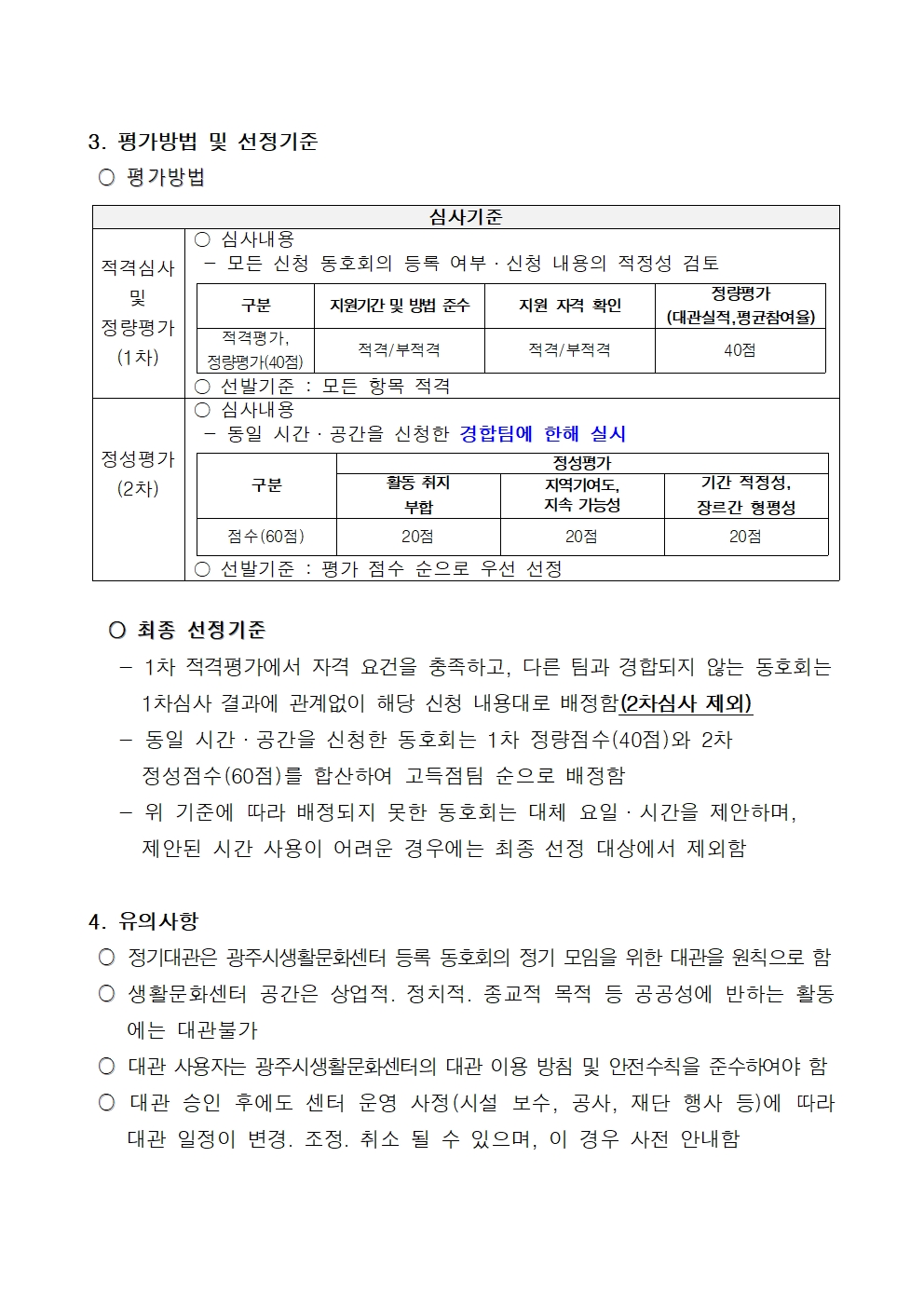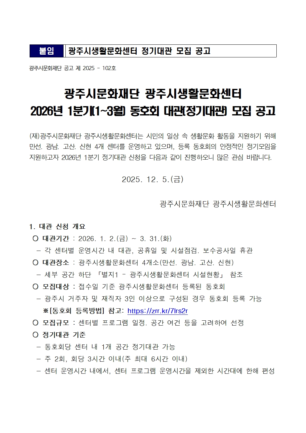 광주시생활문화센터 2026년 1분기(1~3월) 동호회 대관(정기대관) 모집 공고