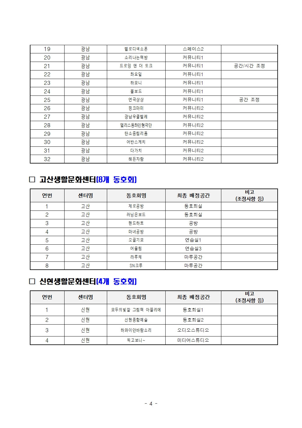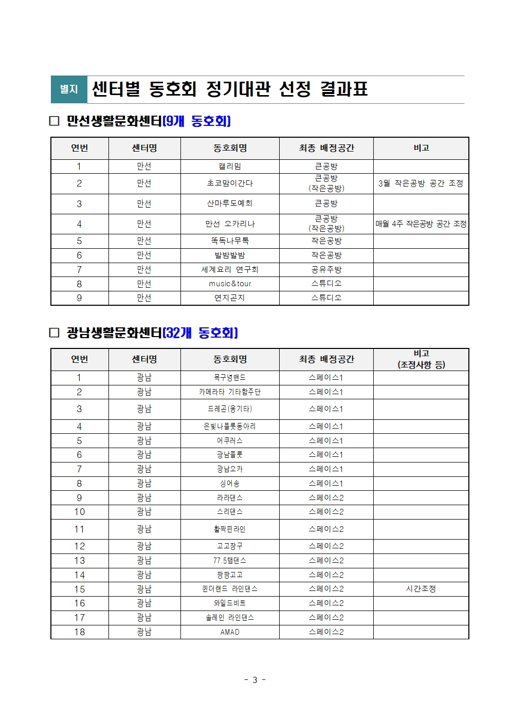 2026년 1분기 동호회 대관(정기대관) 모집결과 공고문