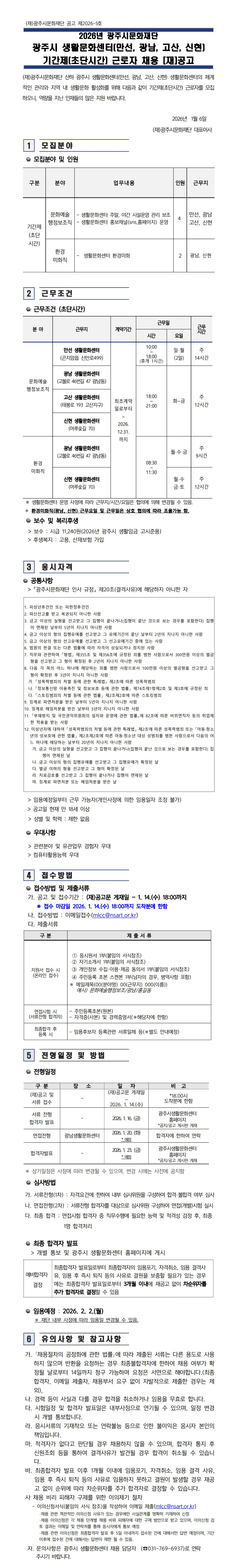 2026년 광주시 생활문화센터(만선, 광남, 고산, 신현) 기간제(초단시간) 근로자 채용 [재]공고