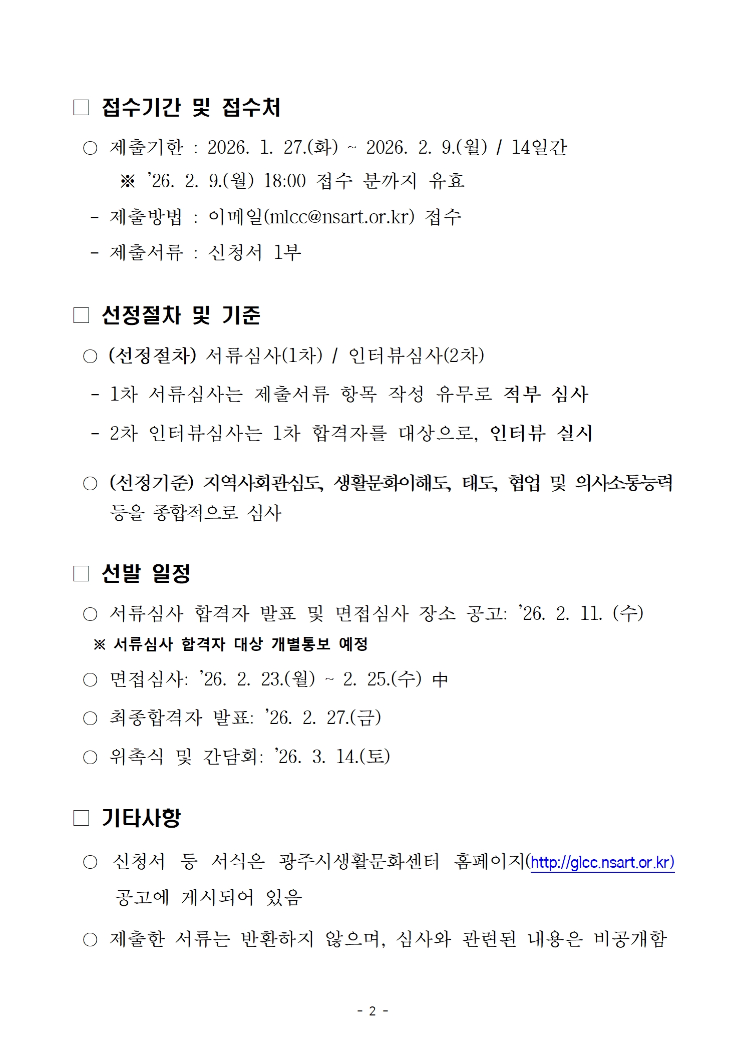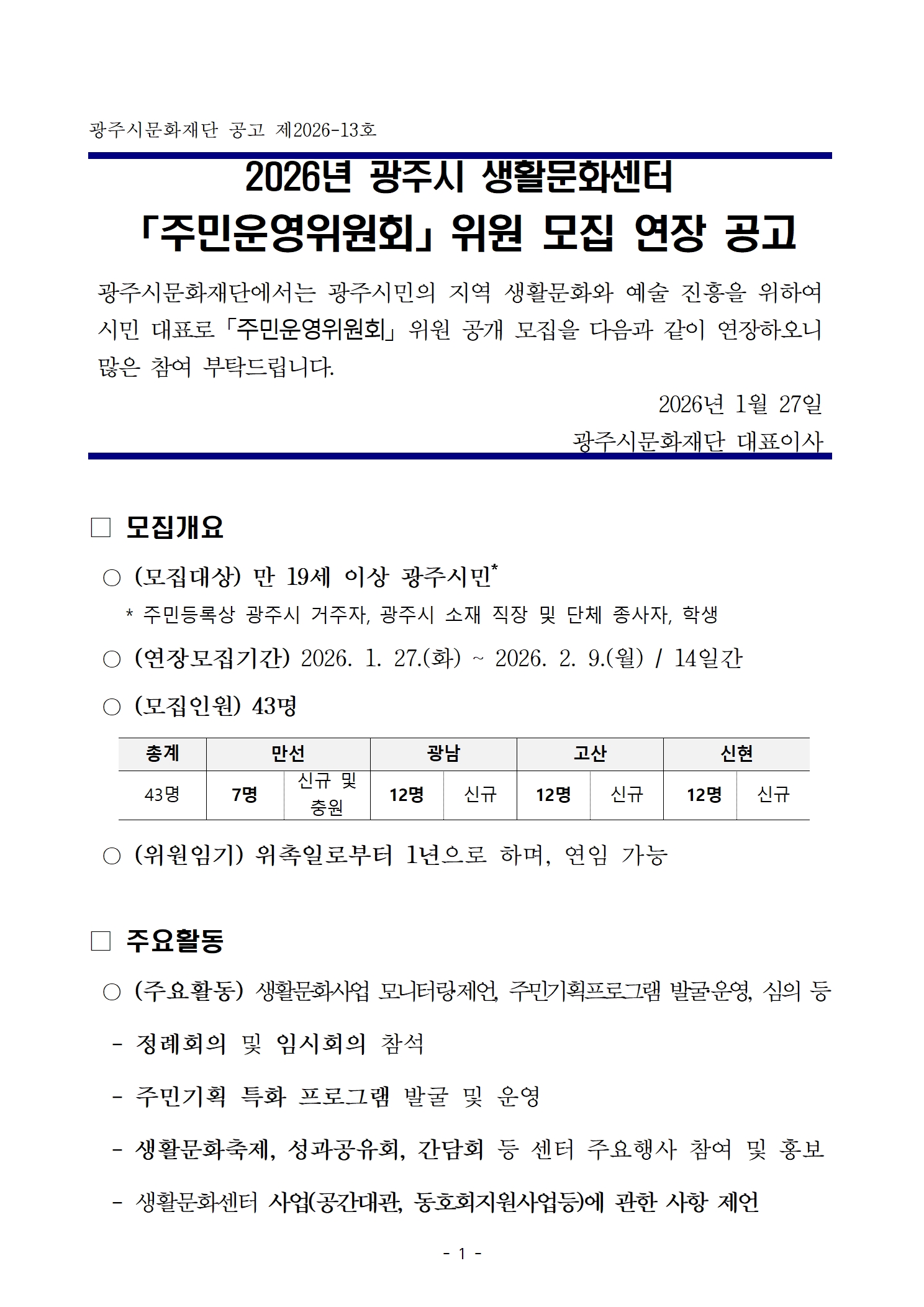 광주시문화재단에서는 좀더 안정적인 2026년도 주민운영위원회 구성을 위하여 모집 기간을 2주간 연장합니다.