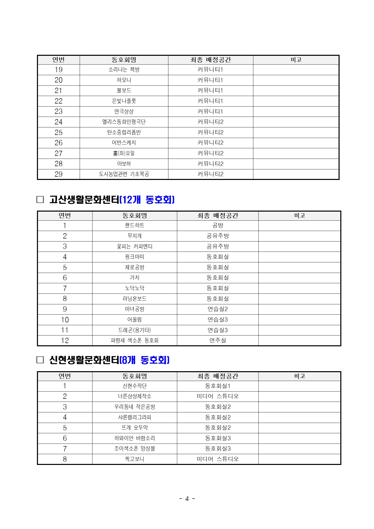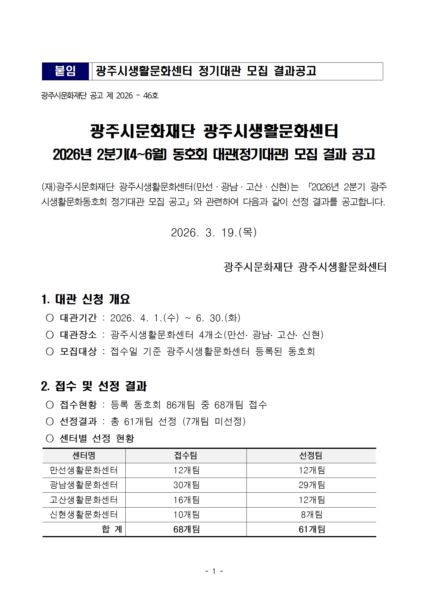 광주시생활문화동호회 대관(정기대관) 모집결과 공고(2026년 2분기)