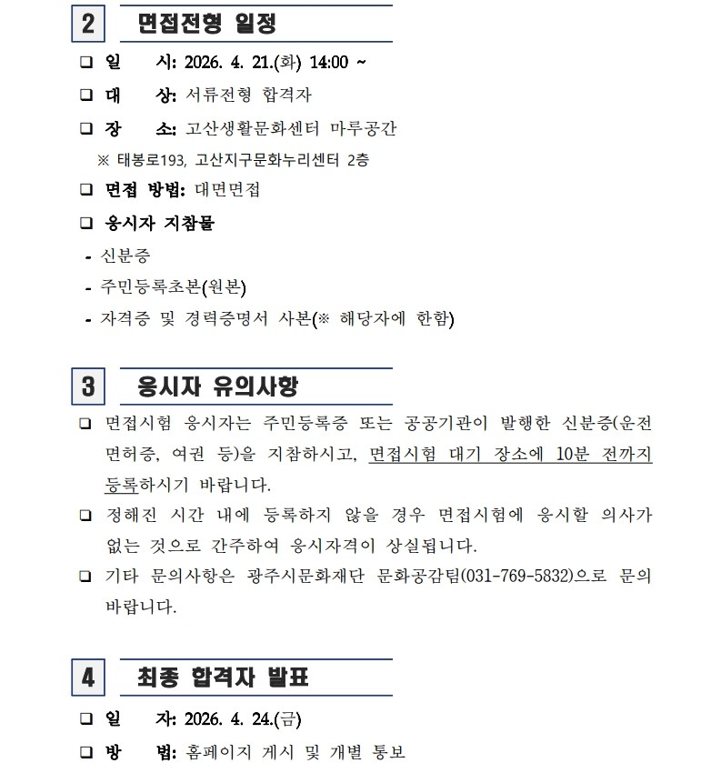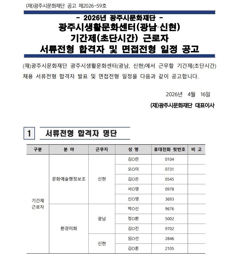 광주시생활문화센터(광남‧신현) 기간제(초단시간) 근로자 채용 서류전형 합격자 및 면접전형 일정 공고