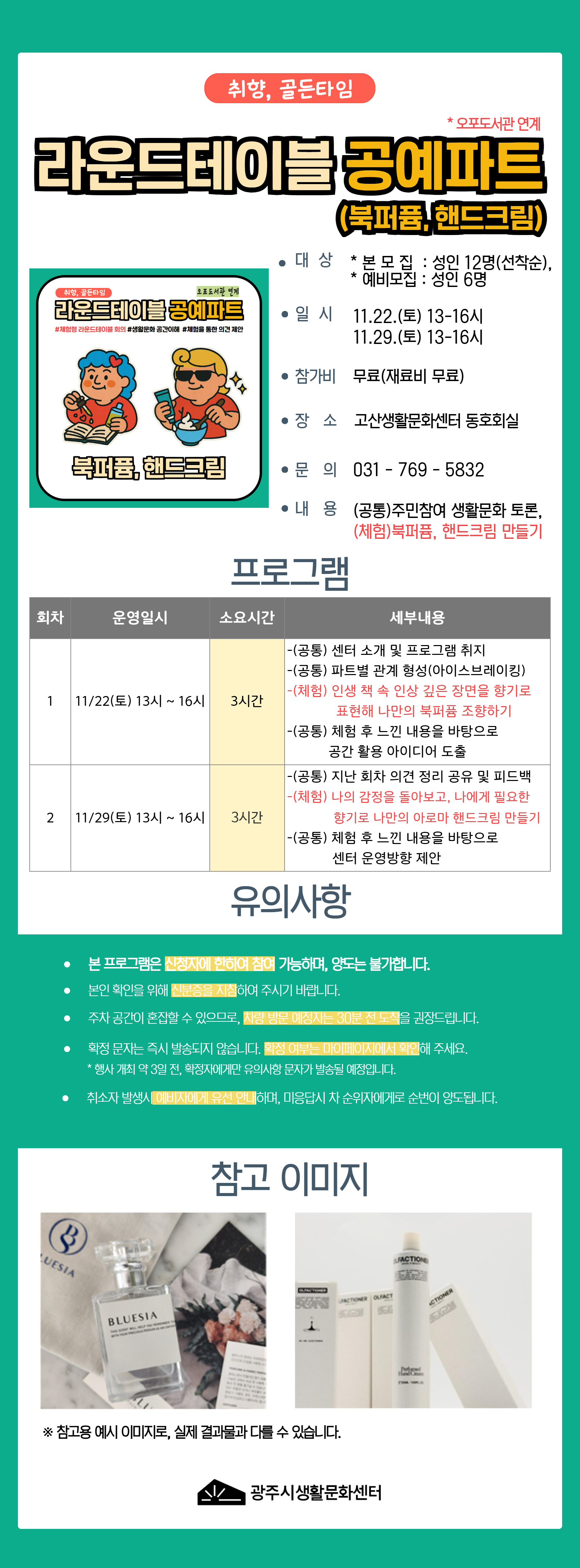 [체험형 라운드테이블 워크숍]<취향,골든타임:공예파트>북퍼퓸, 핸드크림 만들기